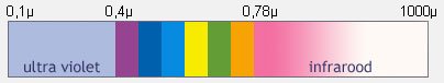 In onderstaand deel van het spectrum onderscheiden we drie soorten straling: ultraviolet, het zichtbare licht en infrarood. Ultra violet en infrarood zijn voor het menselijk oog niet waarneembaar.
